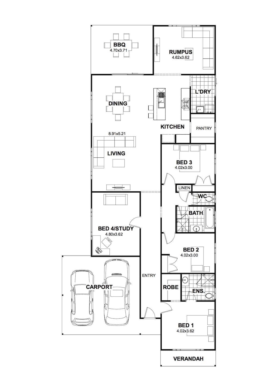 • A separate ACTIVITIES room located at the rear of this layout can function a music room or anything requiring a decent degree of rowdy. Conveniently near the Kitchen and BBQ area yet separated from the sleeping zone.